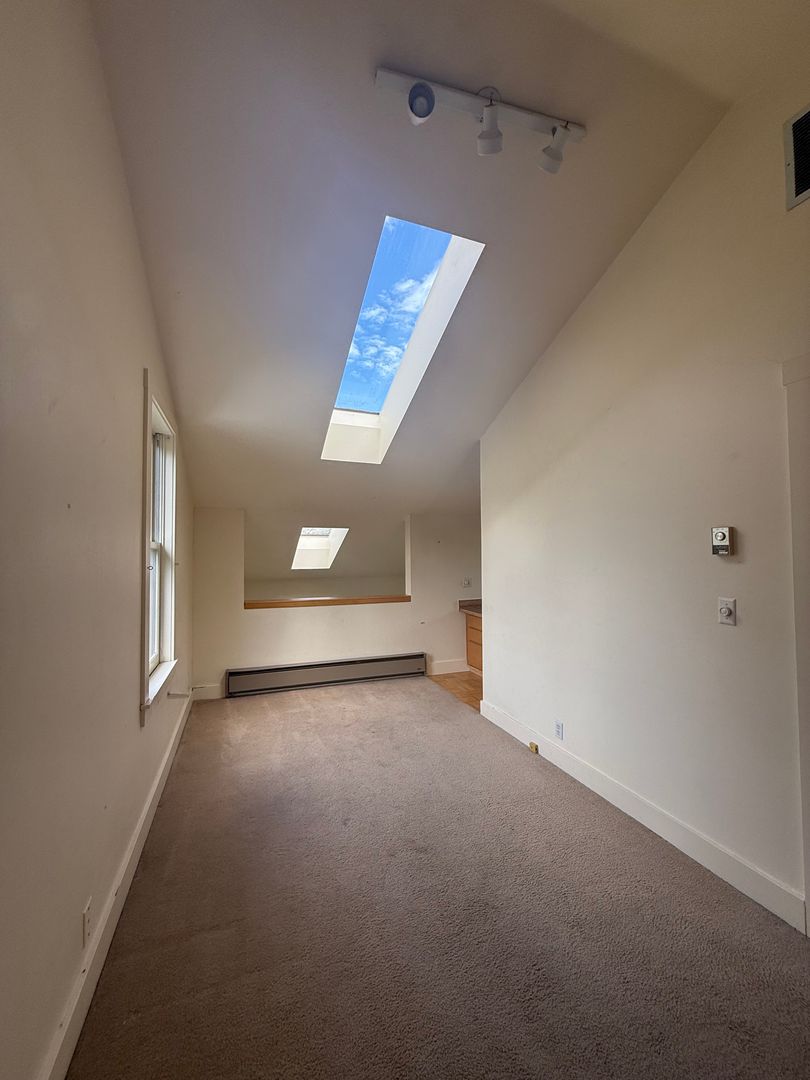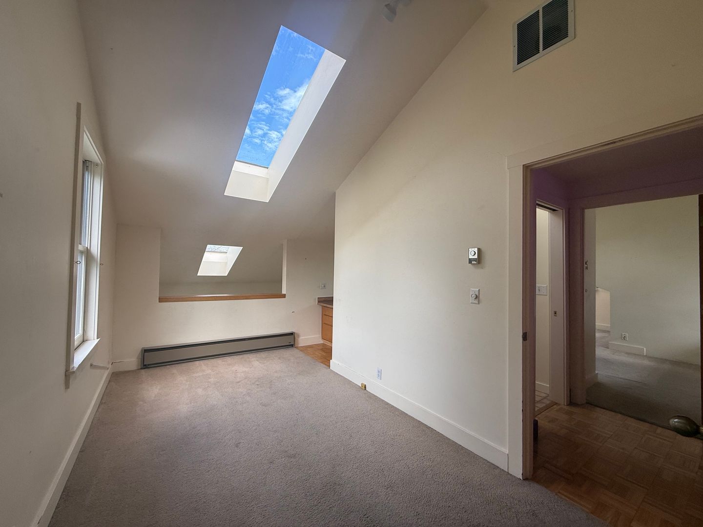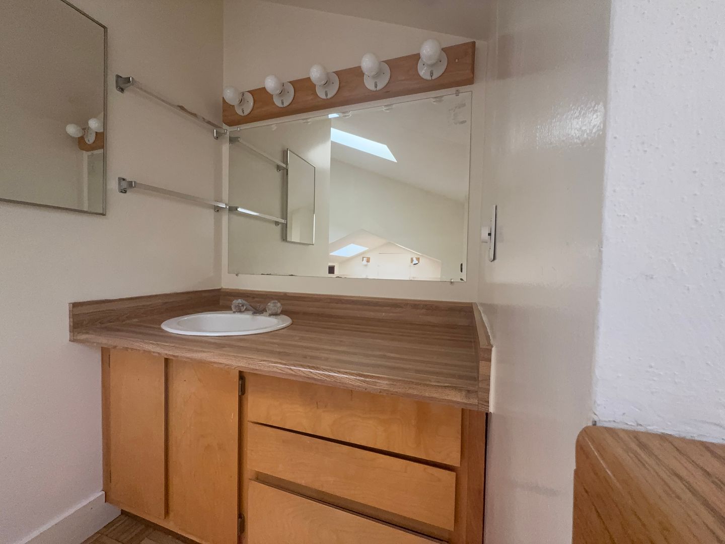 This upstairs, loft-style unit features vaulted ceilings with skylights that fill the space with natural light, a large living room, and two full bathrooms—each bedroom includes its own private vanity.