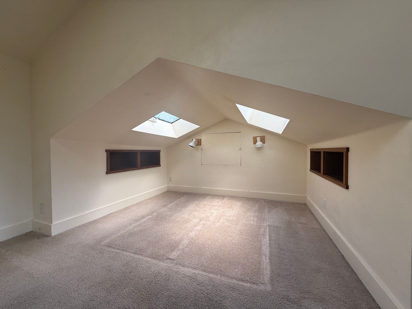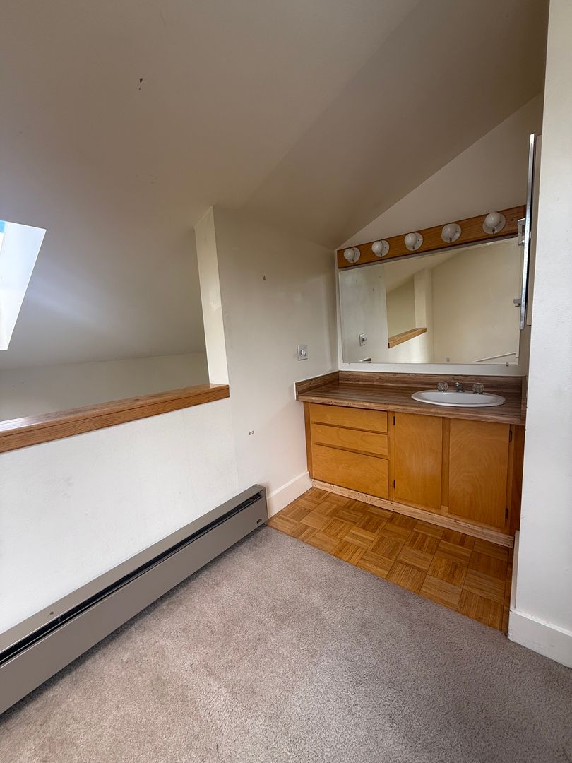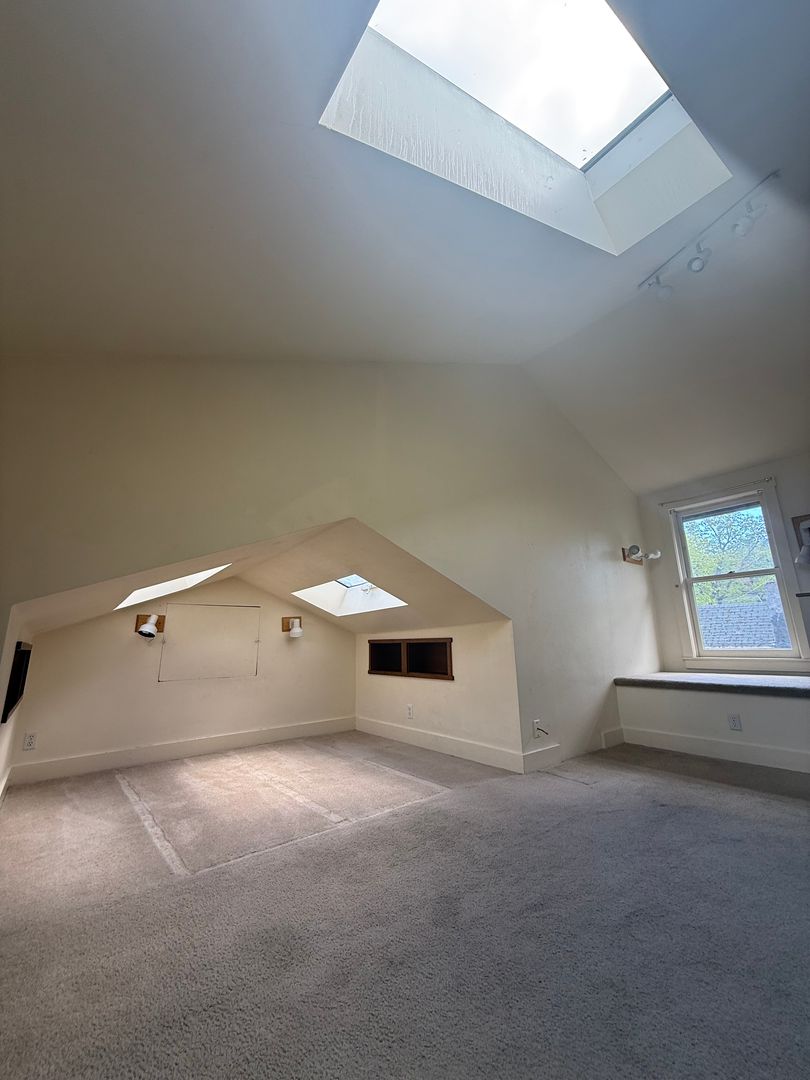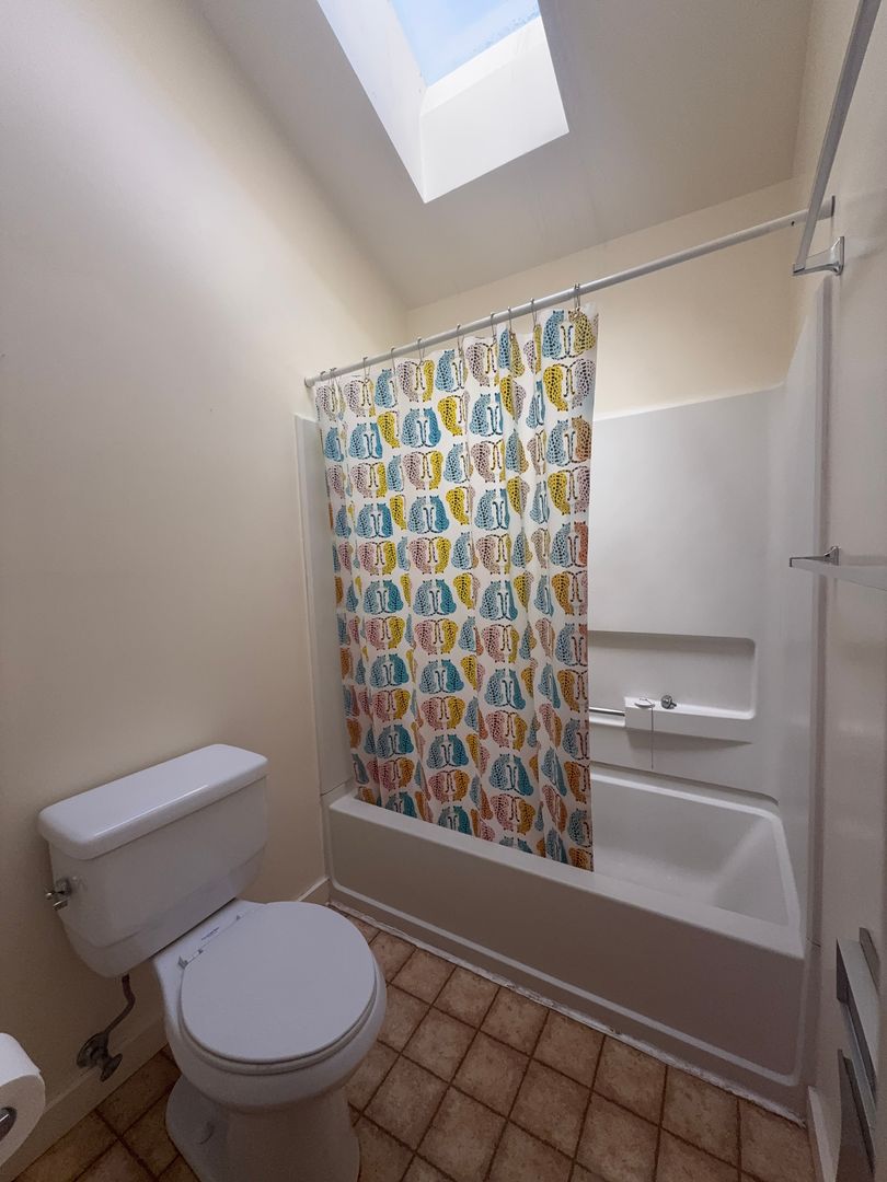 This upstairs, loft-style unit features vaulted ceilings with skylights that fill the space with natural light, a large living room, and two full bathrooms—each bedroom includes its own private vanity.