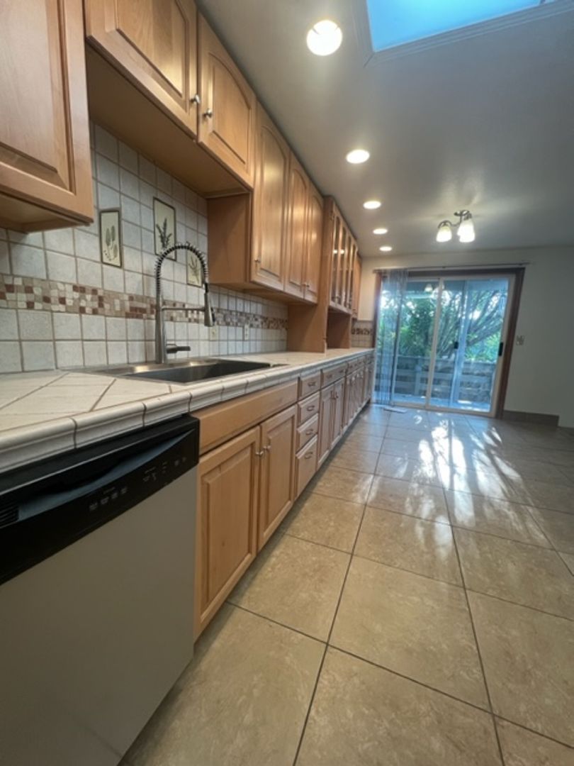 Large open floor plan living and dining room with large windows and new carpet. Sliding glass doors off the dining room lead to a big deck and terraced back-yard. Long expanse of countertop with cabinetry provides cooking prep space as well as display.