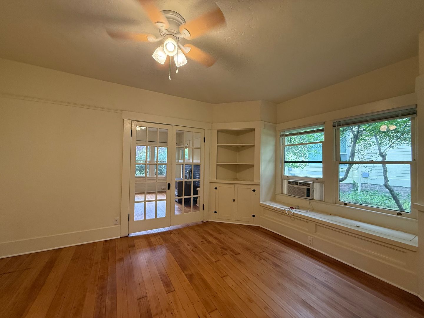 This bungalow-style unit offers a comfortable one-bedroom, one-bath layout with refinished wood floors and built-in storage. Large windows fill the living space with natural light, and a welcoming front porch adds character to the home. Residents have access to a shared backyard and off-street parking.
