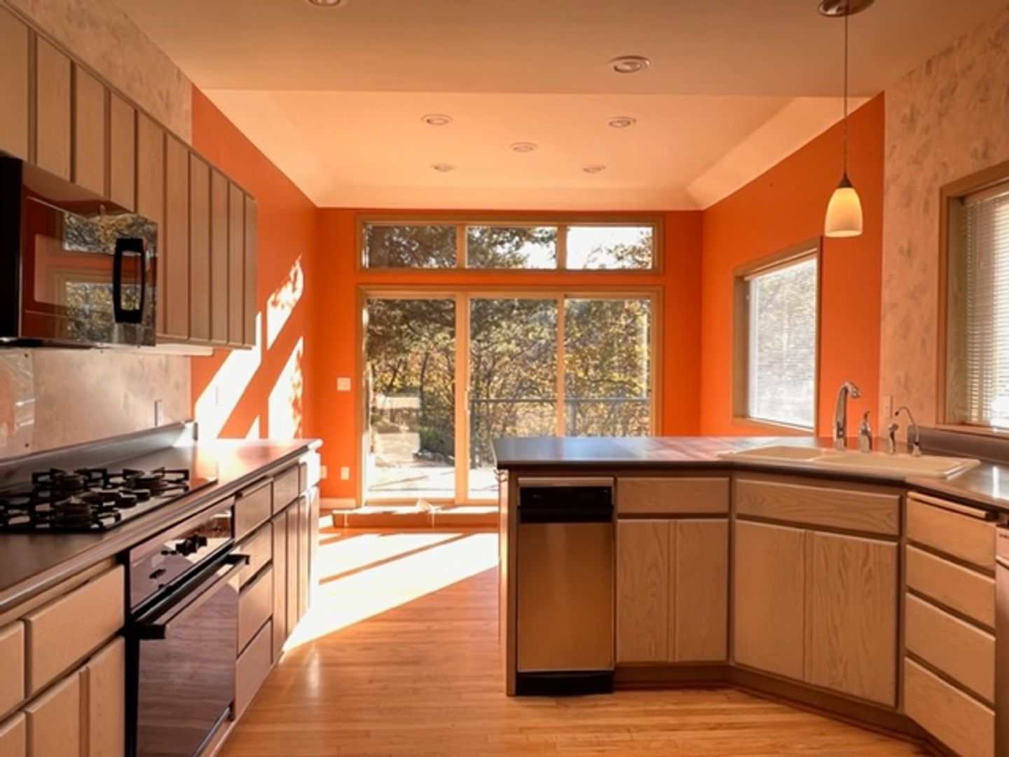Up some steps to the front deck, you will be greeted by a lovely custom entry door. The living area features soaring vaulted ceilings, wood floors, gas fireplace and incredible windows for natural light and views, views, views! Decks off all sides of the living space offer special opportunities for quiet relaxation or entertaining alike.