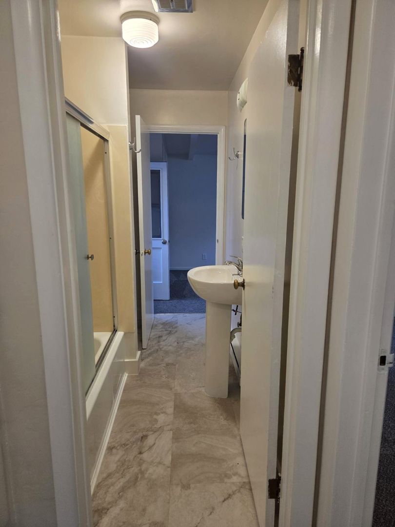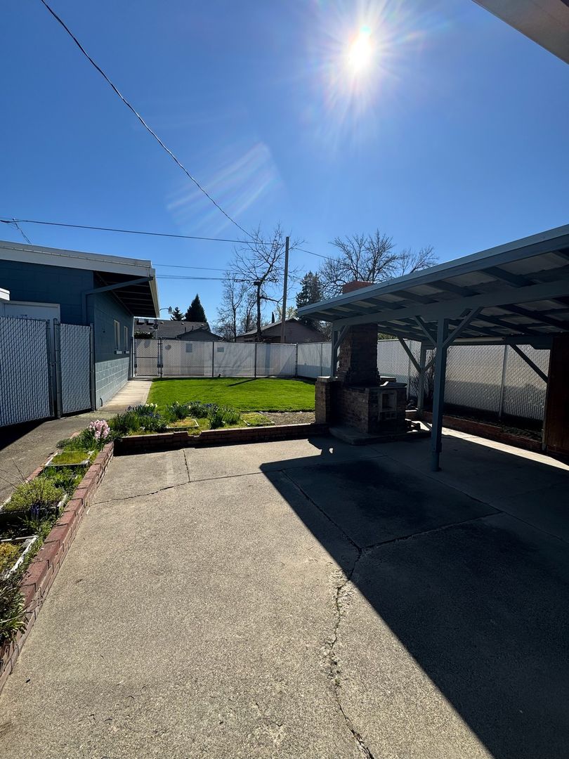 Deep lot features a large yard, covered patio and detached garage. Shop off of alley is not included in the rental. Off street parking.
